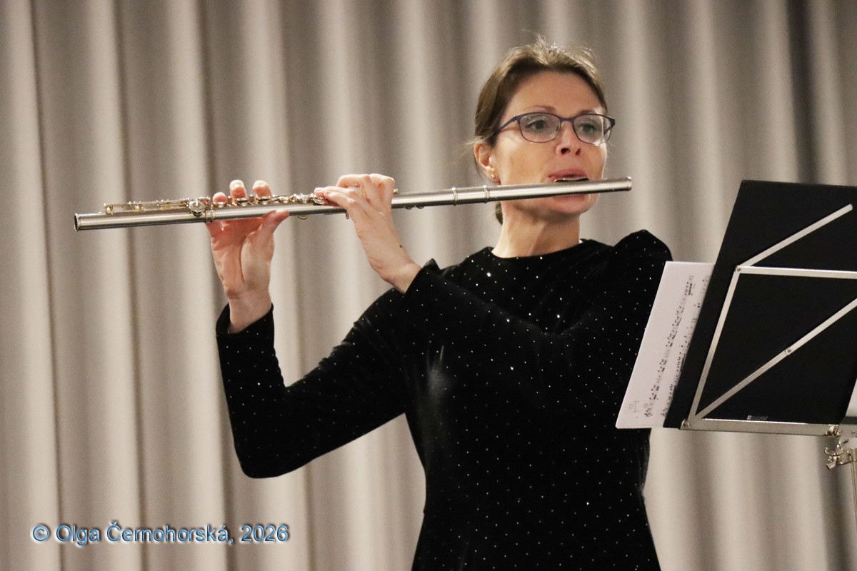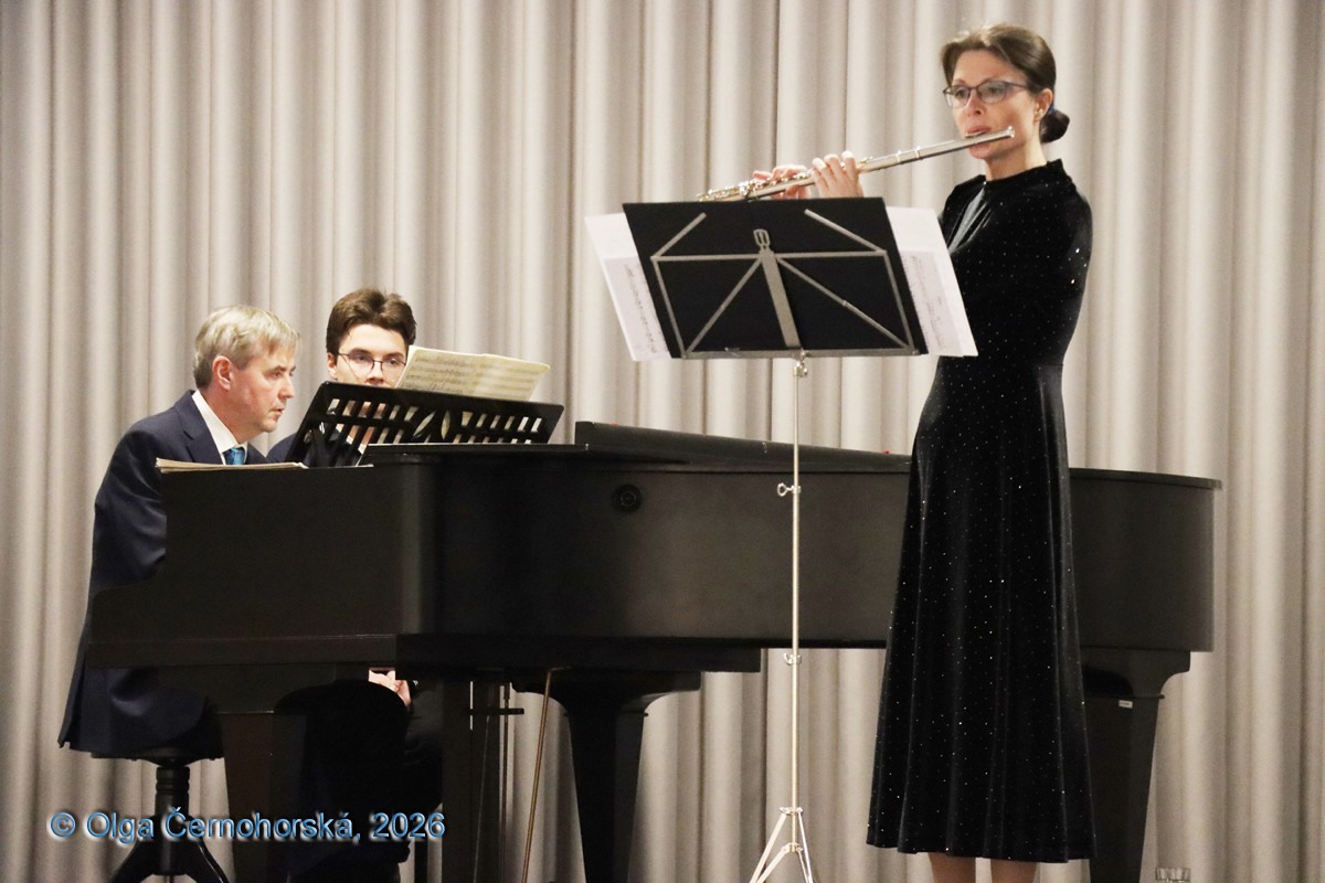 V další části zazněla Sonáta pro flétnu a klavír od Paula Hindemitha, která měla opět tři části: Heiter bewegt, Sehr langsam a Sehr lebhaft, Marsch. I závěrečnou část koncertu jsme si poslechli v provedení Dua DACAPO. Sonatina semplice od Petra Ebena měla také tři části: Allegro giusto, Moderato e cantabile a Vivace e accentato, které byly skutečnou závěrečnou hudební lahůdkou, jež publikum ocenilo dlouhým uznalým potleskem, a účinkující se museli na jeviště několikrát vracet klanět. I tento koncert se velice vydařil a my se už můžeme těšit na další pokračování hudebního cyklu, který se bude konat na stejném místě ve čtvrtek 16. dubna 2026 v 19 hodin.